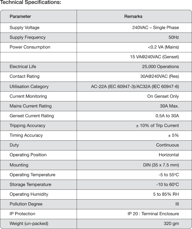 Power consumed is less then 0.2VA during Mains supply & 15VA during generator operation